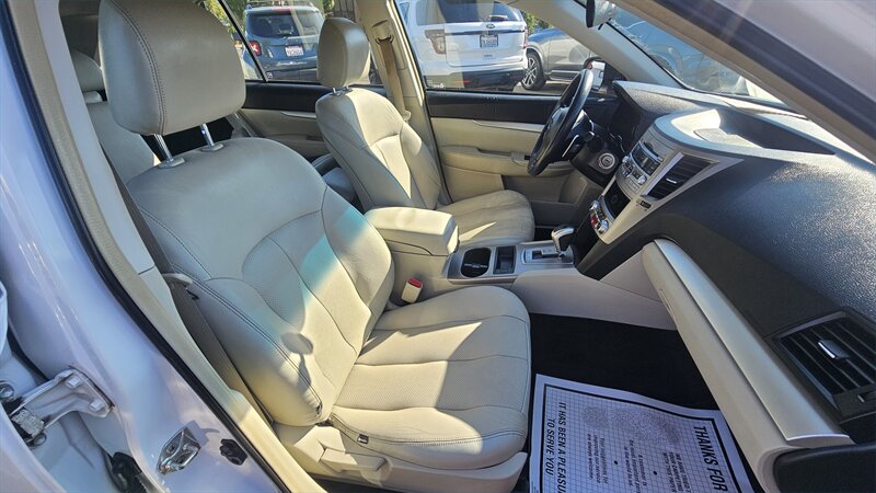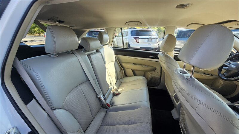 This 2012 Subaru Outback 2.5i, finished in Satin White Pearl with a Warm Ivory interior, is equipped with a 2.5L H4 170hp 170ft. lbs. PZEV engine. The factory default features include all-wheel drive, a roof rack, alloy wheels, fog lights, cloth upholstery, power accessories, air conditioning, cruise control, a tilt-and-telescoping steering wheel, Bluetooth connectivity, and a four-speaker sound system with CD player and auxiliary input. With fuel efficiency rated at 22 MPG in the city and 29 MPG on the highway, this Outback is in excellent condition with a clean CARFAX report.
